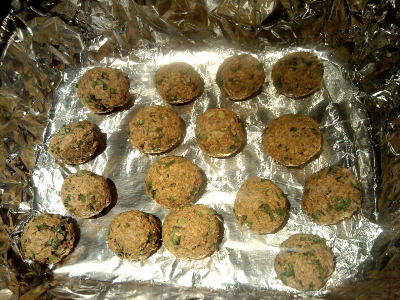 i decided to use the walnut oat burger recipe instead… added cilantro, garlic, scallions. rolled them into balls, baked at 350F for 15 min.